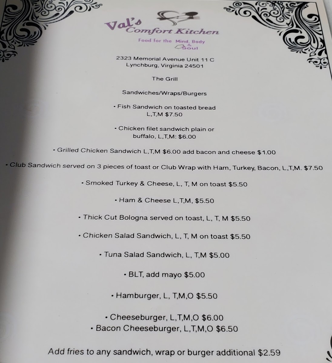 Val's Comfort Kitchen Menu